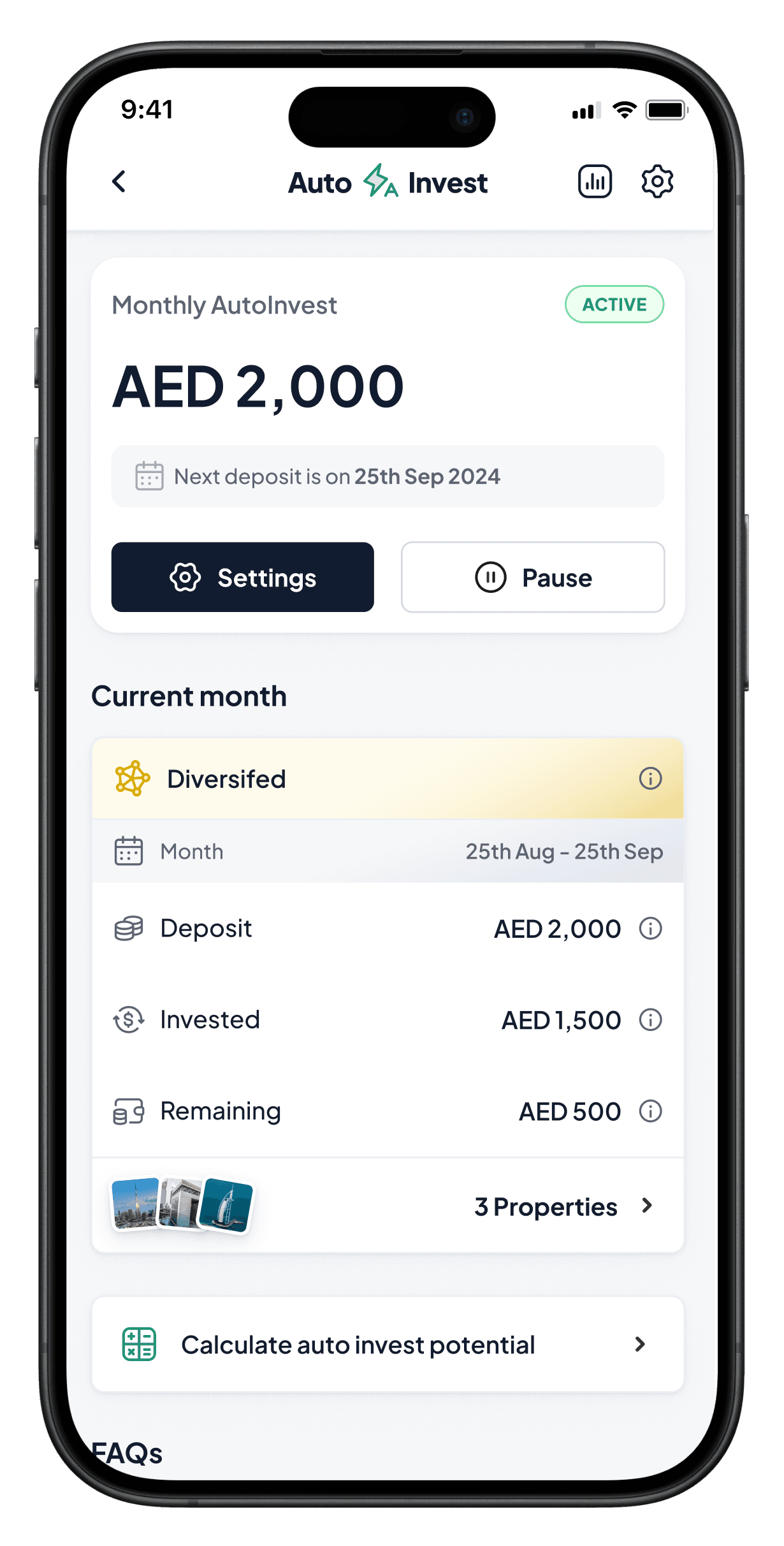 Set up a monthly investment plan that allocates your funds on autopilot into Dubai properties based on your preferred theme—whether it's growth, income, or diversified.